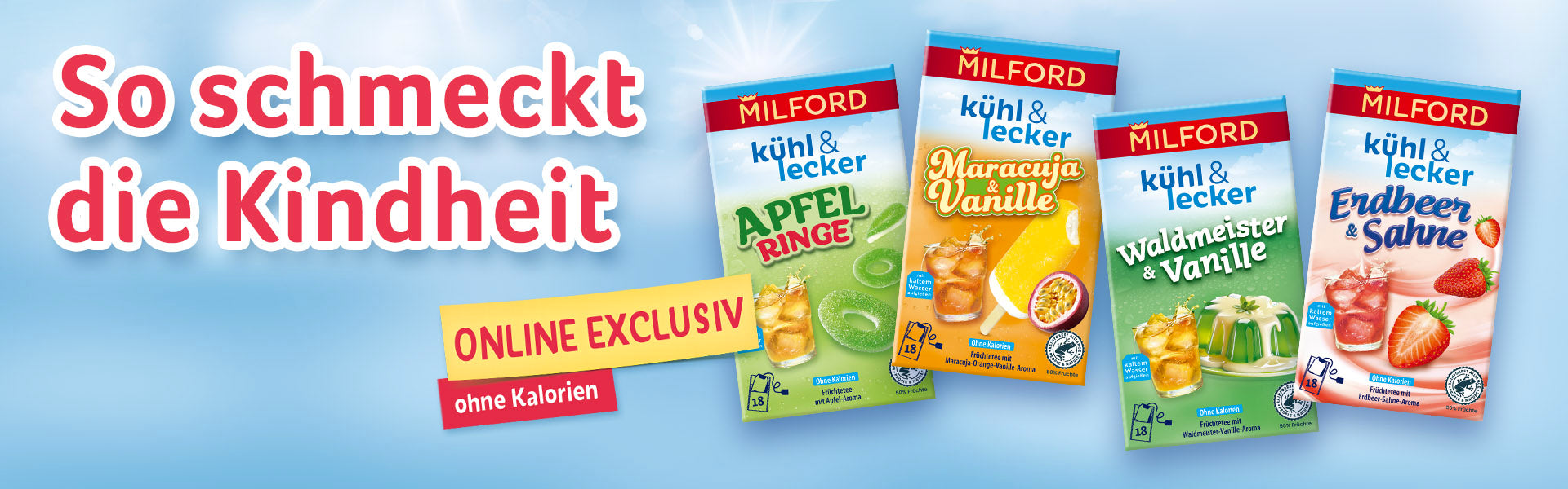 Genieß die positiven Dinge mit Milford kühl & lecker! Die frischen, süßen Aromen schenken dir eine Geschmacksexplosion in jedem Glas. Find deinen neuen Milford kühl & lecker-Lieblingstee, der dir ein Lächeln ins Gesicht zaubert.