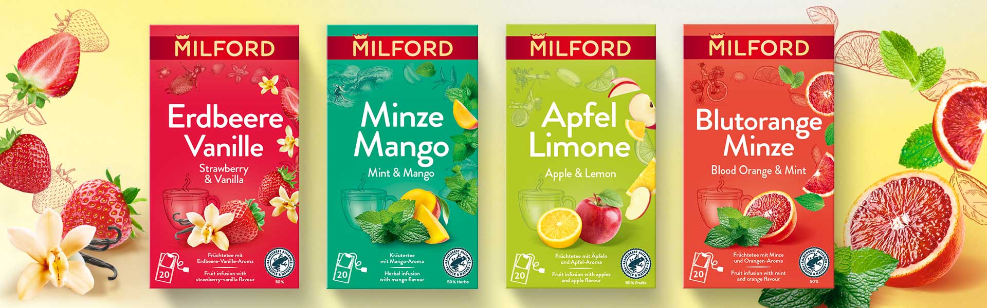 Die positiven Dinge des Lebens genießen – und dazu beitragen, sie zu erhalten: Dafür stehen wir bei MILFORD. Daher machen wir richtig gute, unvergleichlich geschmacksintensive Tees aus Kräutern und Früchten, die ein gutes Gefühl machen. Weil sie besonders vollmundig im Geschmack sind. Und weil sie alle aus kontrolliert nachhaltigem Anbau stammen, zertifiziert nach den Vorgaben der Rainforest Alliance™.